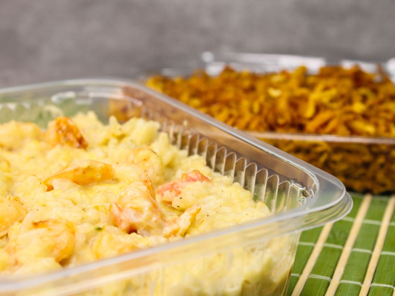 Filé de Camarão Temperado ao Molho 3 Queijos (Gorgonzola, Provolone, Requeijão Light), refogado junto com arroz branco e servido com batata palha doce bem sequinha (Vai a parte em embalagem apropriada)