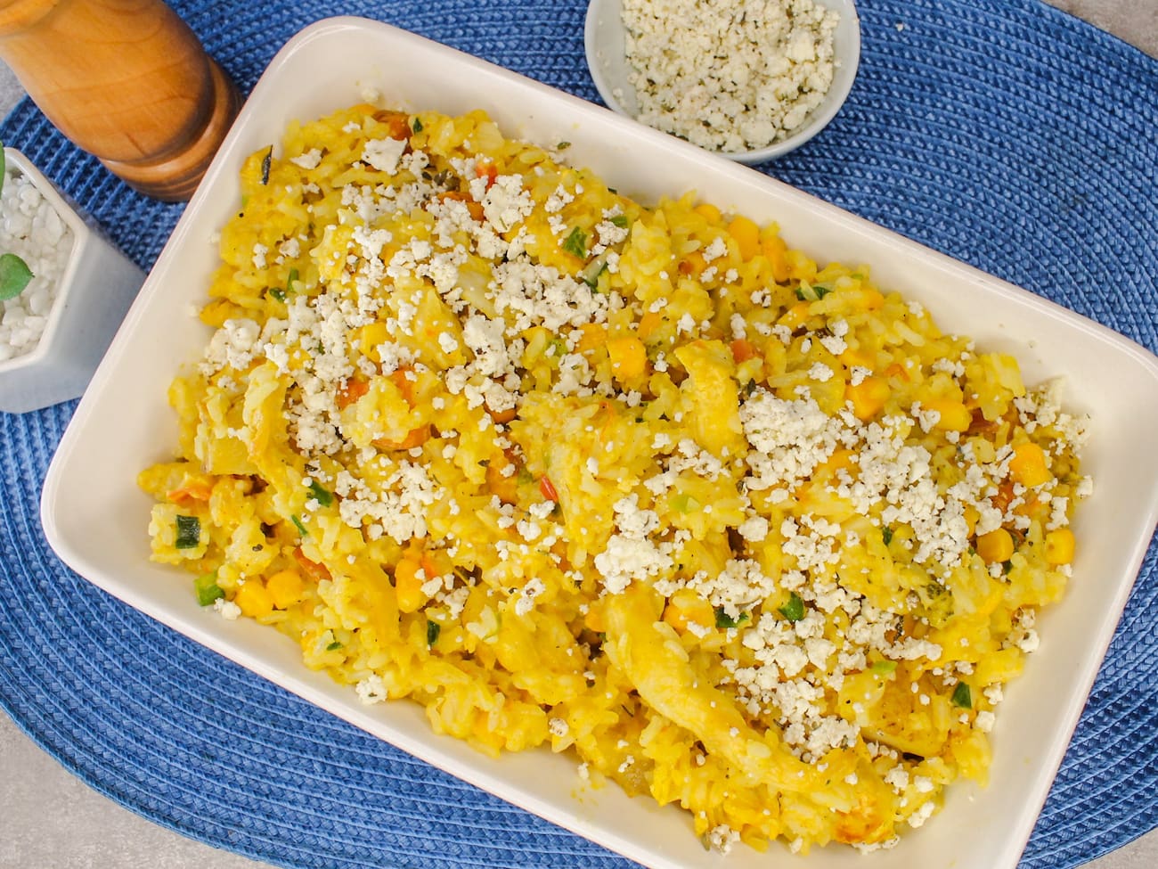 Arroz de frango cremoso. Arroz branco com molho branco, isca de frango, legumes refogados e milho verde. Finalizado com queijo ricota
