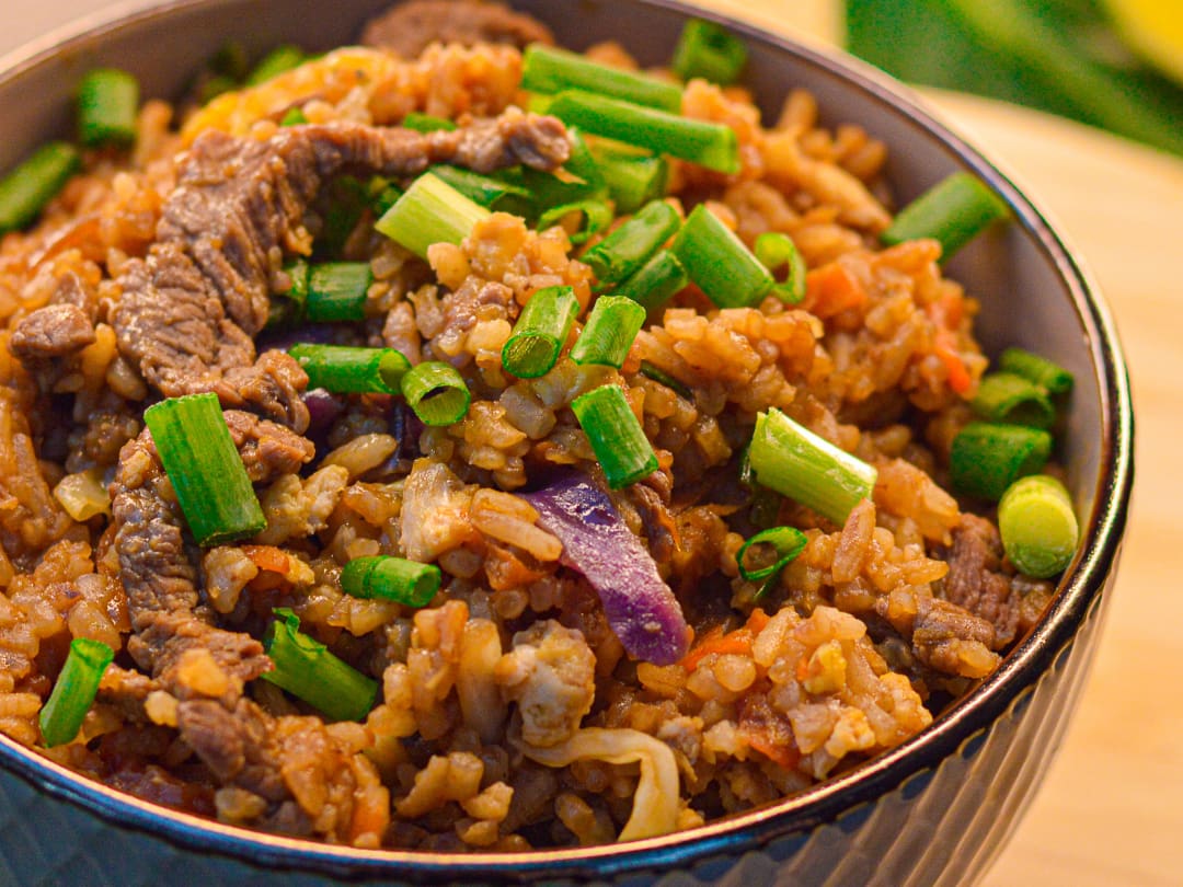 Tiririnhas de Coxão Mole grelhado salteado no Wok com Arroz Levemente Apimentado (Feito ao estilo Thai, no Wok), refogado com repolhos, tomate picado, cenoura ralada, ovos mexidos, cebolinha + Molho Bangkok (Molho de tamarindo, saque e açúcar demerara) . Servido super quentinho.