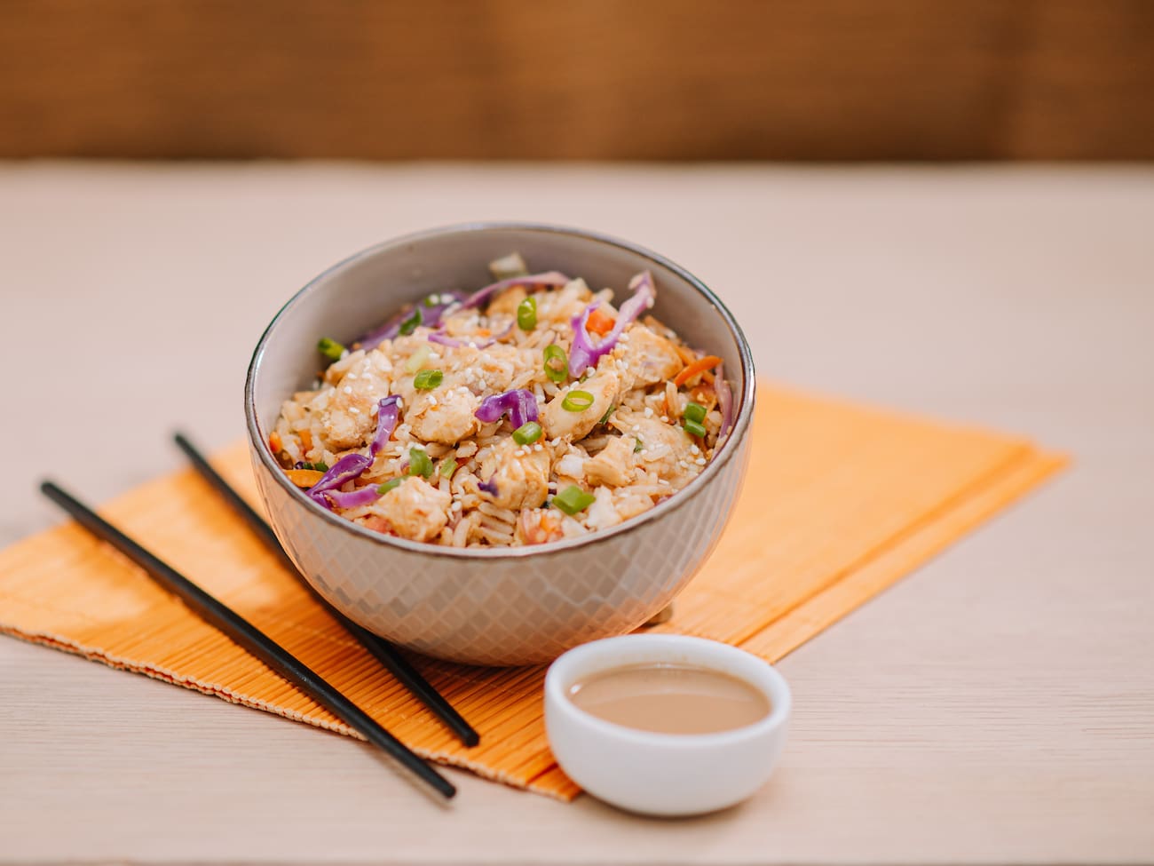 Tiras de filé de Frango grelhado salteado no Wok com Arroz Levemente Apimentado (Feito ao estilo Thai, no Wok), refogado com repolhos, tomate picado, cenoura ralada, ovos mexidos, cebolinha + Molho Satay (amendoim, shoyu e leite de coco) da Casa. Servido super quentinho.