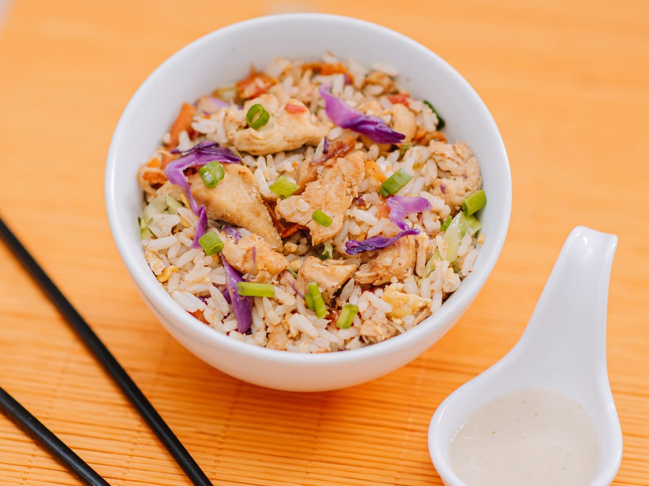 Tiras de filé de Frango grelhado salteado no Wok com Arroz Levemente Apimentado (Feito ao estilo Thai, no Wok), refogado com repolhos, tomate picado, cenoura ralada, ovos mexidos, cebolinha + Molho Curry Verde (leite de coco, capim santo, coentro e gengibre)da Casa. Servido super quentinho.