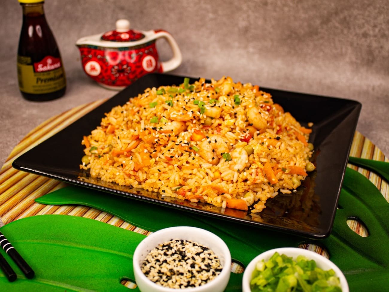 Arroz salteado no Wok com Alho, cebola, cenoura, Milho, Ovos, Ervilha e cebolinha com Filé de Camarão Limpo (240g) temperado ao molho Base Spicy da Casa (Não é extremamente apimentado). Tudo feito na hora e enviado bem quente. Serve super bem 2 a 3 pessoas.