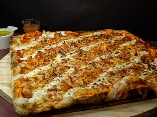 Pizza Quadrada Grande (Bem maior que Pizzas Tradicionais Redondas) de Massa Americana Maturada, Molho De Tomate Caseiro, Mussarela, Salmão, Requeijão, Gergelim branco E Oregáno. Enjoy! Serve de 3 a 4 pessoas. 16 Pedaços. Feita com ingredientes selecionados e da maior qualidade!