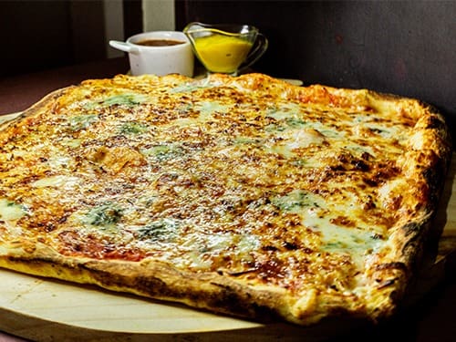 Pizza Quadrada Grande (Bem maior que Pizzas Tradicionais Redondas) de Molho De Tomate, Mussarela, Provolone, Gongonzola, Coalho E Oregáno. Enjoy! Serve de 3 a 4 pessoas. 16 Pedaços. Feita com ingredientes selecionados e da maior qualidade!