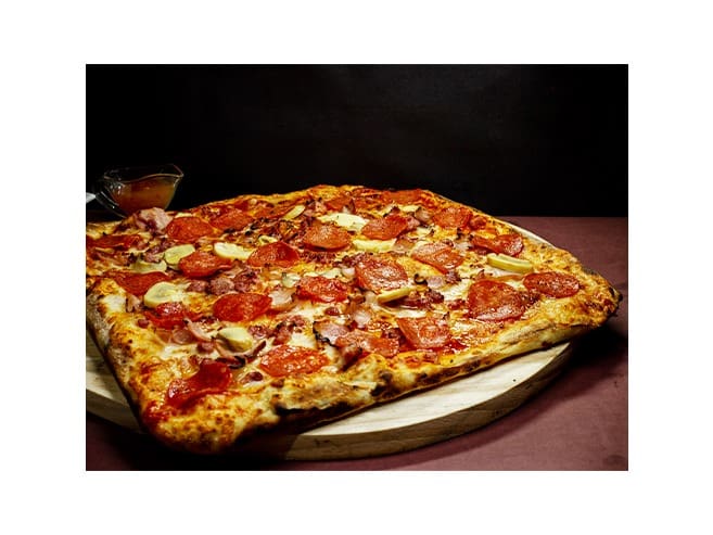 Pizza Quadrada Grande (Bem maior que Pizzas Tradicionais Redondas) de Massa Americana Maturada, Molho De Tomate Caseiro, Mussarela, Calabria: Calabresa + Geleia de Pimenta da Casa e Oregáno. Enjoy! Serve de 3 a 4 pessoas. 16 Pedaços. Feita com ingredientes selecionados e da maior qualidade!