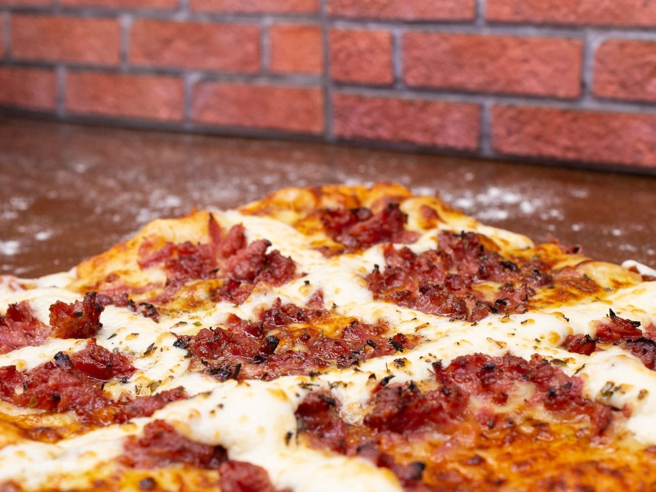 Pizza Quadrada Grande (Bem maior que Pizzas Tradicionais Redondas) de Massa Americana Maturada, Molho De Tomate Caseiro, Mussarela, Calabresa Moída e Requeijão Cremoso. Serve de 3 a 4 pessoas. 16 Pedaços. Feita com ingredientes selecionados e da maior qualidade!