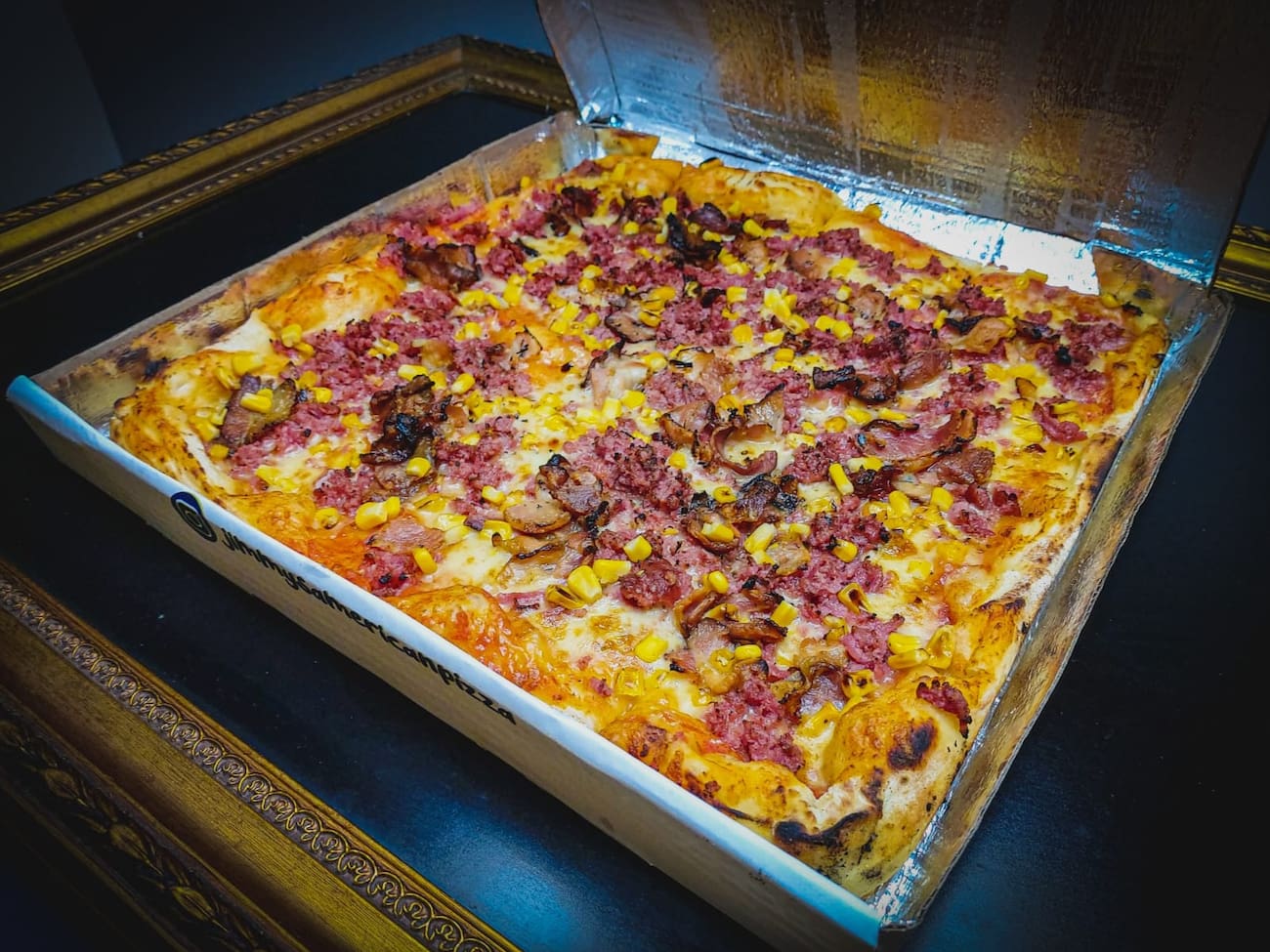 Pizza Quadrada Grande (Bem maior que Pizzas Tradicionais Redondas) de Massa Americana Maturada, Molho De Tomate Caseiro, Mussarela, Bacon, Calabresa e Milho Enjoy!