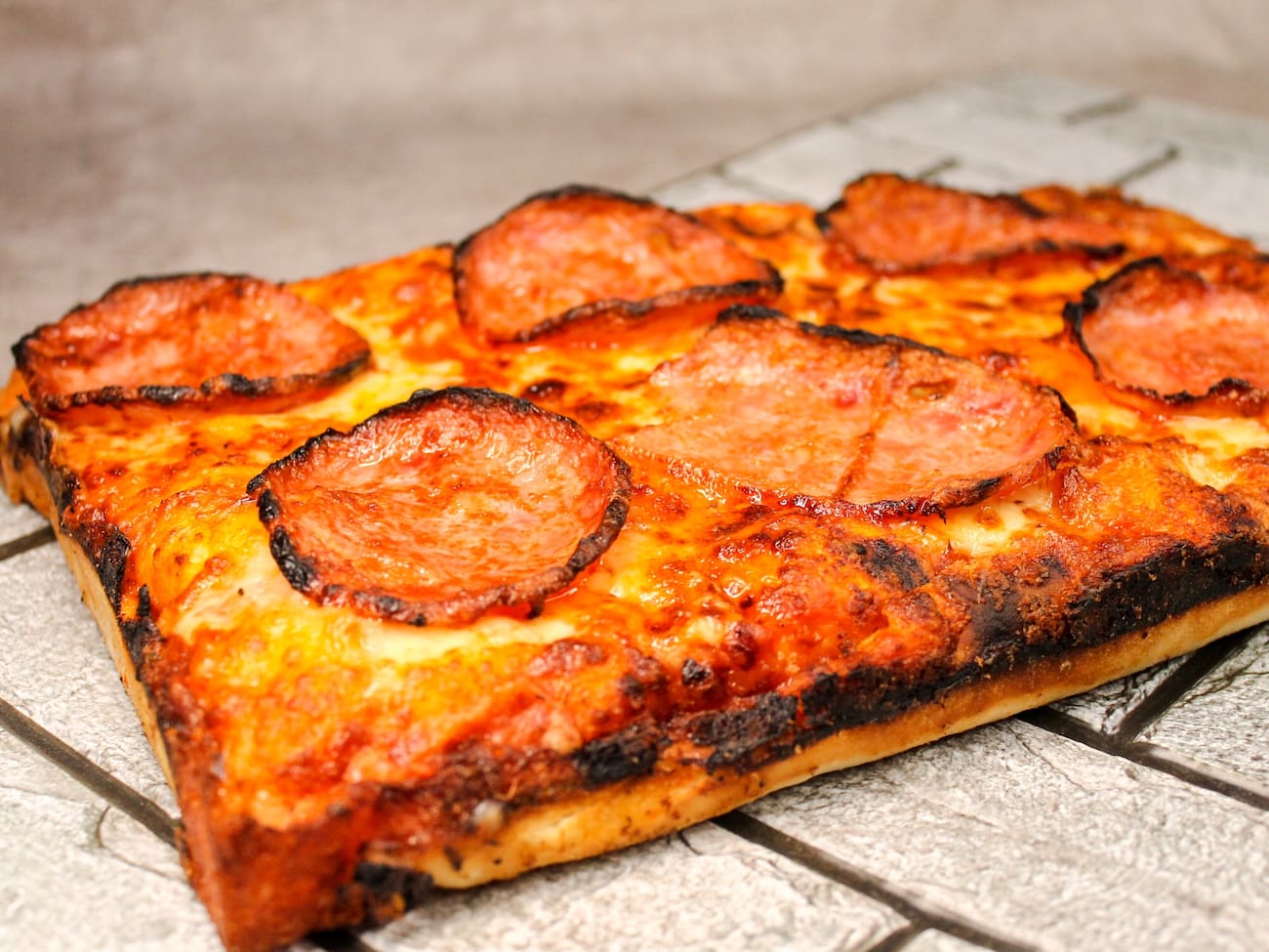 Pizza Quadrada e bem assada! Borda Crispy ao estilo pizza Detroit Americana. Massa Pan. Server até 3 pessoas.