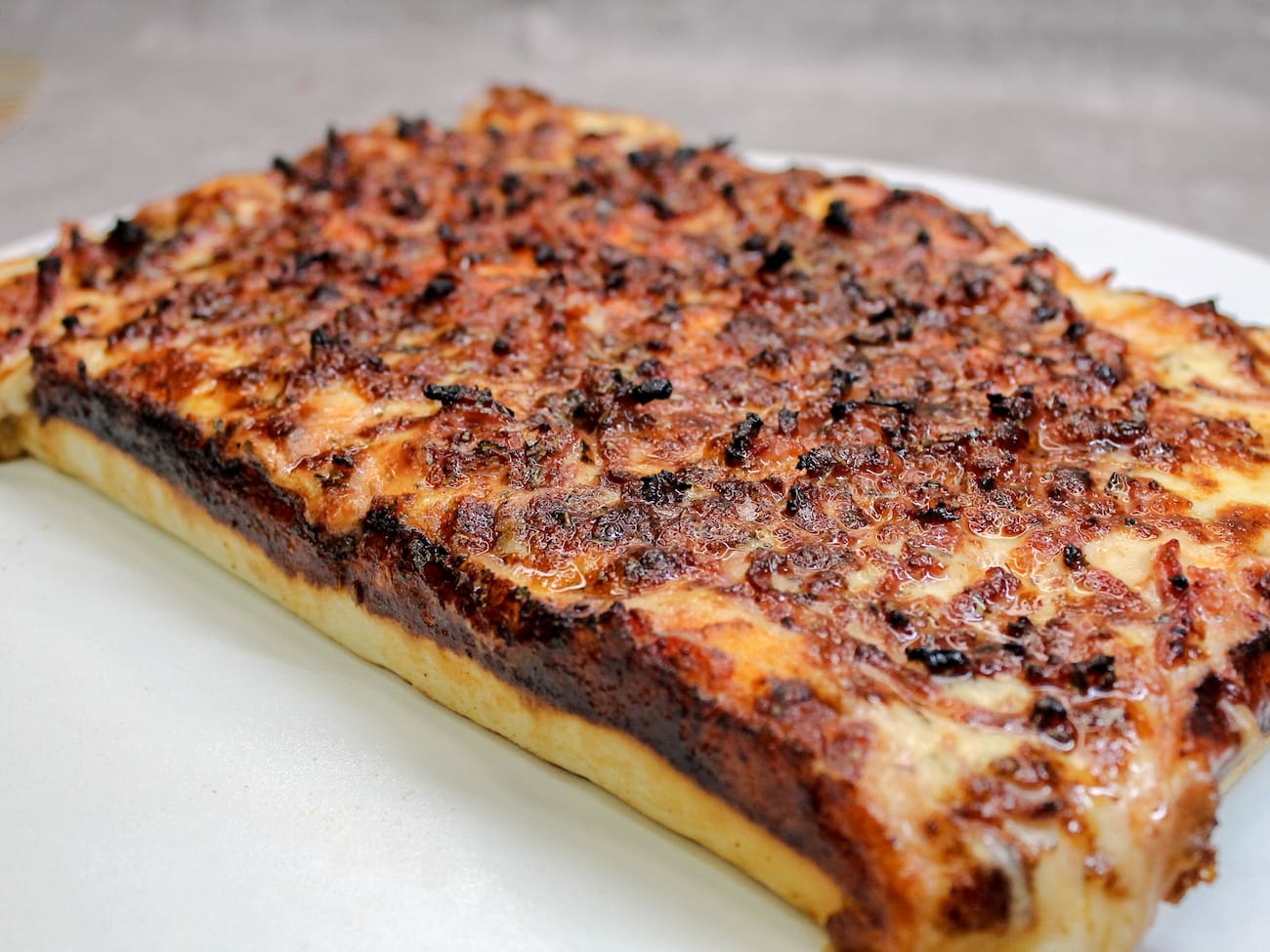 Calabresa Moída com queijo. Pizza Quadrada e bem assada! Borda Crispy ao estilo pizza Detroit Americana. Massa Pan. Serve até 3 pessoas.