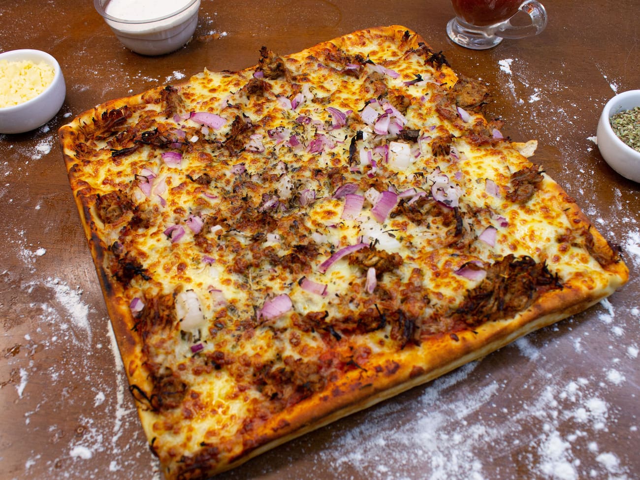 Pizza Quadrada Grande (Bem maior que Pizzas Tradicionais Redondas) de Massa Americana Maturada, Molho De Tomate Caseiro, Mussarela, Carne De Sol Desfiada, Cebola Roxa e Oregáno, Enjoy! Serve de 3 a 4 pessoas. 16 Pedaços. Feita com ingredientes selecionados e da maior qualidade!