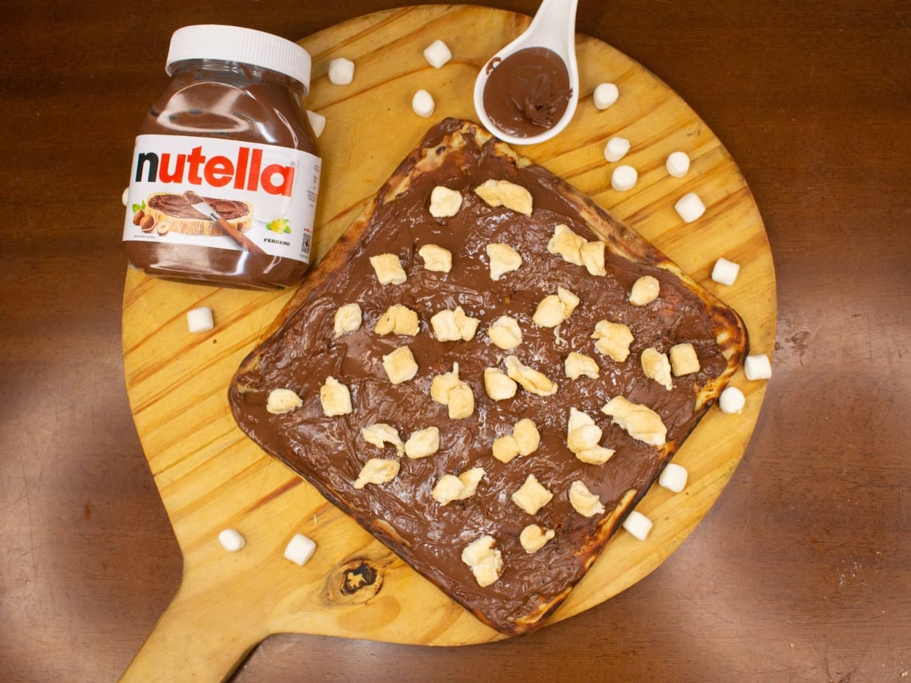 Pizza Quadrada Grande (Bem maior que Pizzas Tradicionais Redondas) de Massa Maturada Americana,Pizza de chocolate e chocolate branco + Chocolate Caramelizado (Really Good). Serve de 3 a 4 pessoas. 16 Pedaços. Feita com ingredientes selecionados e da maior qualidade!