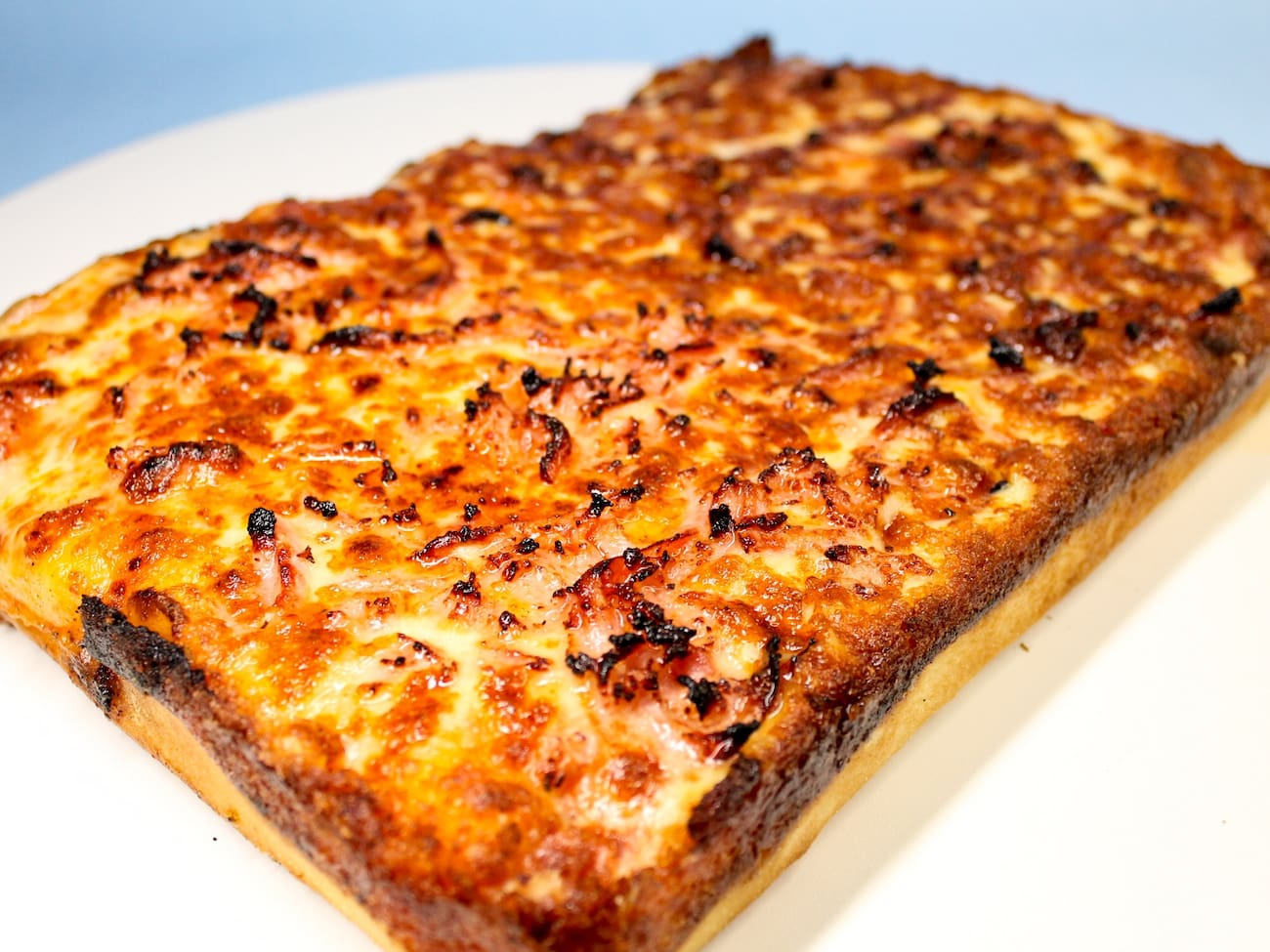 Pizza Quadrada e bem assada! Borda Crispy ao estilo pizza Detroit Americana. Massa Pan. Server até 3 pessoas.