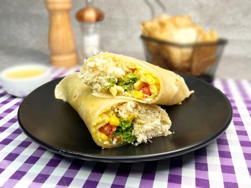 Massa de Wrap Leve, Frango desfiado refogado na hora (quentinho), Tomate Picado, Alface Crespa , Milho , Ricota light e Molho Ceaser. Acompanha Generosa porção de Chips de Batata Doce da Casa.