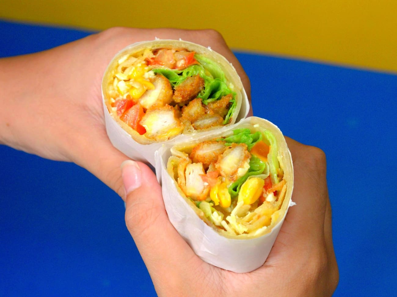 Massa de Wrap Leve, Frango Empanado na Panko cortado em Tiras, Tomate Picado, Alface Crespa , Milho , Ricota light e Molho. Acompanha Generosa porção de Chips de Batata Doce da Casa