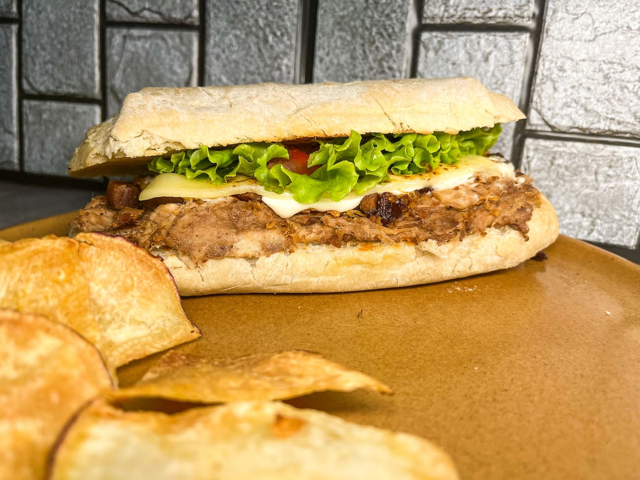 Delicioso Pão Ciabatta Quentinho e chapeado + Carne do Sol Desfiada da Casa ao Molho de Requeijão +, Alface e Tomate Picado + Molho a sua escolha. Acompanha Porção de Chips de Batata Doce da Casa. Sanduiche super bem servido.