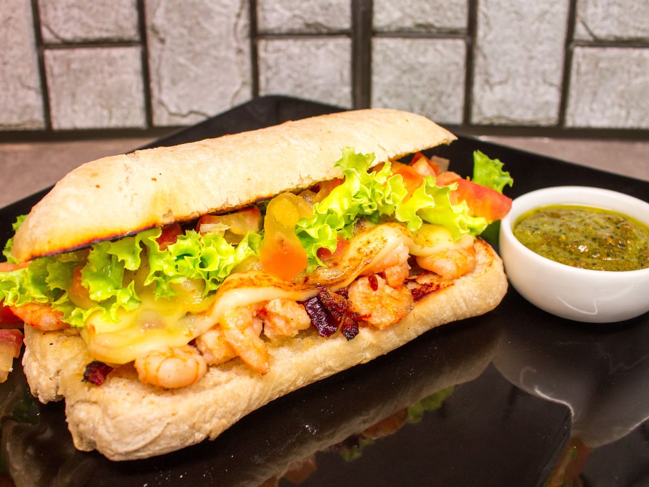 Delicioso Pão Ciabatta Quentinho e chapeado + Filé de Camarão refogado na hora + Bacon Crocante + Requeijão Cremoso , Alface e Tomate Picado + Molho a sua escolha. Acompanha Porção de Chips de Batata Doce da Casa. Sanduiche super bem servido.