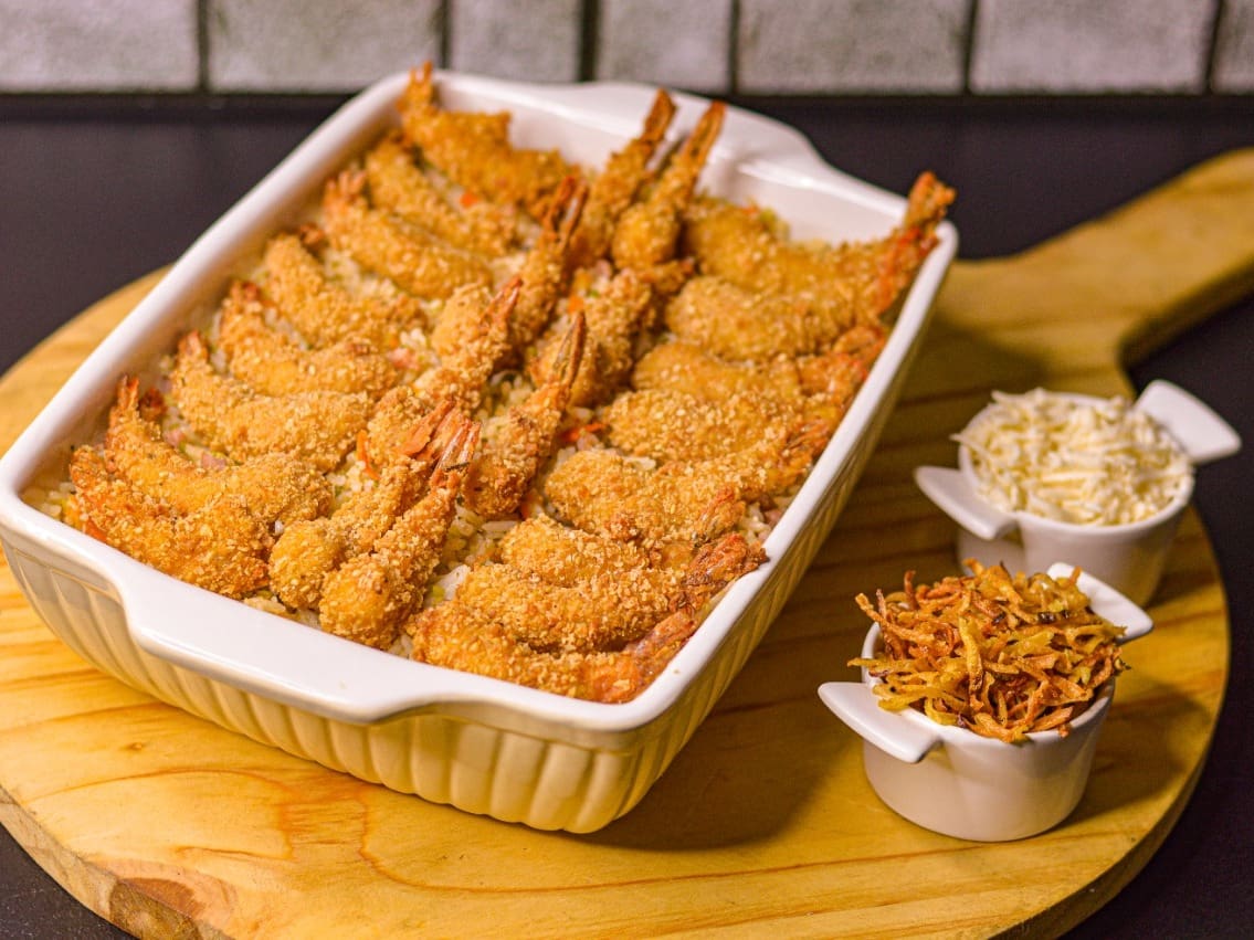 Arroz temperado com presunto magro sadia, cenoura, cebola, curry, alho e molho de requeijão light, finalizado com Camarões empanados na farinha panko e finalizado com queijo ricota. Acompanha batata palha crocante de batata doce. Serve super bem 3 pessoas, não se preocupe.