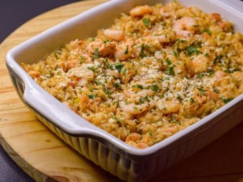 Arroz temperado com presunto magro sadia, cenoura, cebola, curry, alho e molho de requeijão light, finalizado com Camarões empanados na farinha panko e finalizado com queijo ricota. Acompanha batata palha crocante de batata doce. Serve super bem 3 pessoas, não se preocupe.