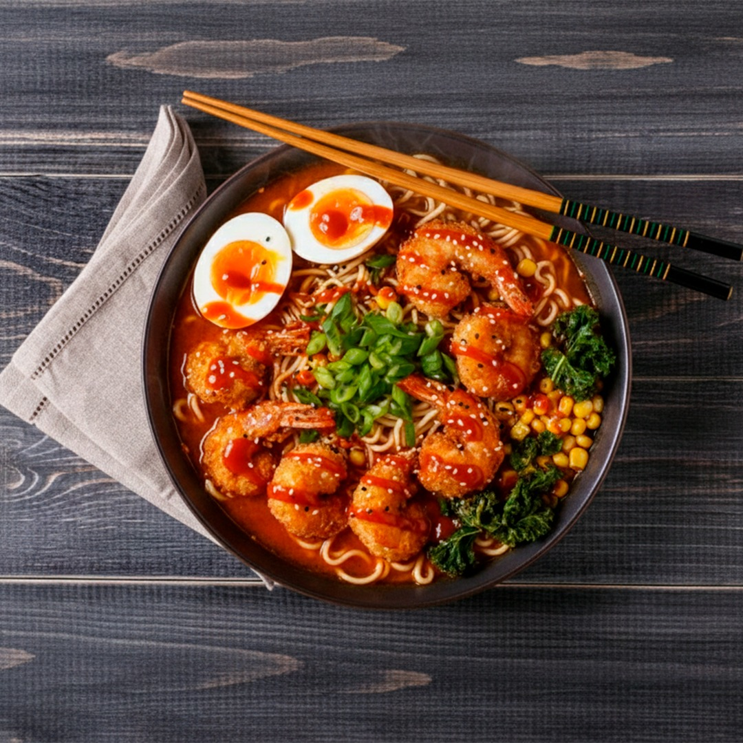 Base típica japonesa temperada, acompanhada de Couve Crispy , Milho, Ovos, Cebolinha e finalizado com Gergelim Torrado. Filé de camarao Empanado no molho Spicy (Não é super picante) (120g) + Caldo do Lamén a sua escolha. Peso total de 600g. Serve super bem e o caldo vai Bem quente.
