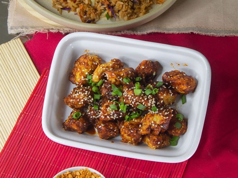 240g de Filé de Frango cortado em cubos Temperados e refogados, cobertos com molho Bangkok Spicy da casa. Feito na hora e servido Quentinho.
