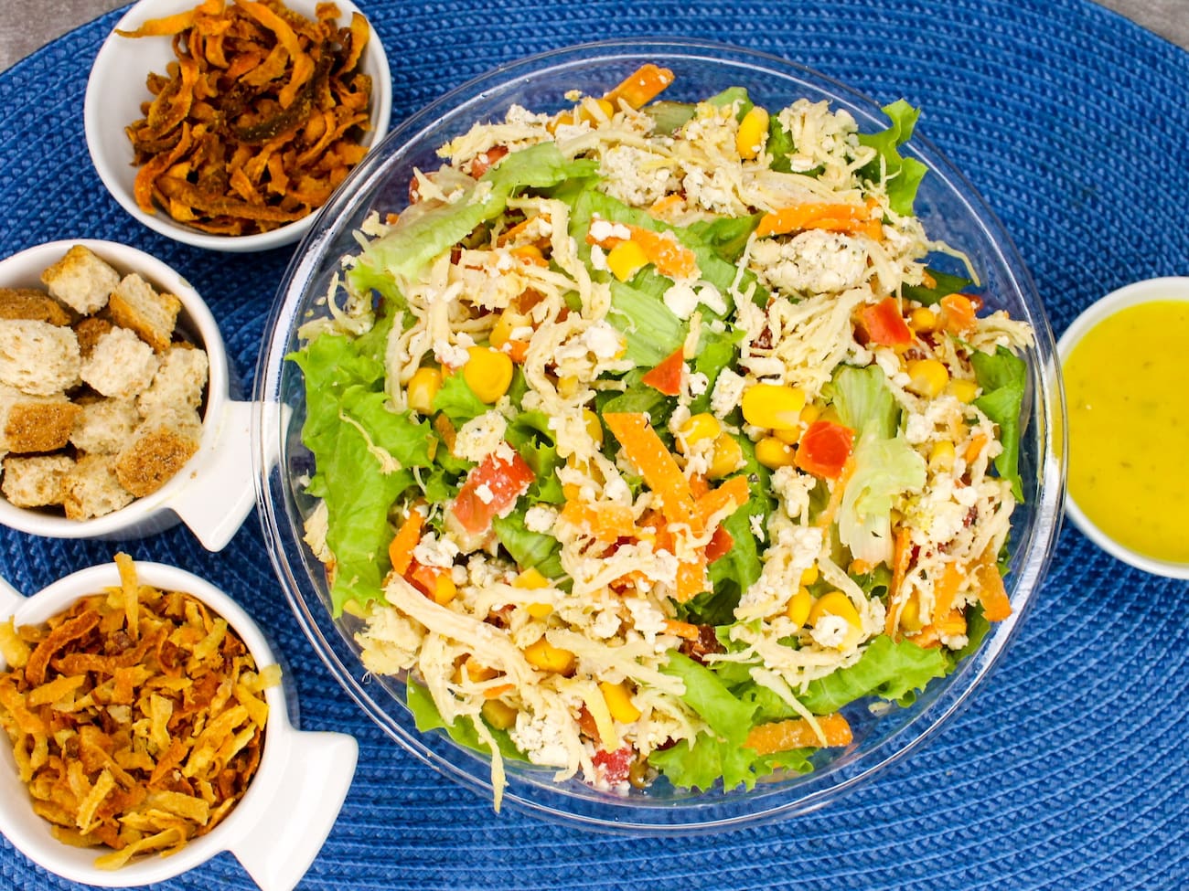 Mix de Alface + Tomate Picado + Cenoura Ralada + Frango Desfiado + Ricota Light Temperada.