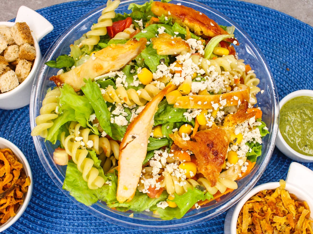 Mix de Alface + Tomate Picado + Cenoura Ralada + Frango Grelhado em Tiras + Macarrão Fusilli + Ricota Light Temperada.