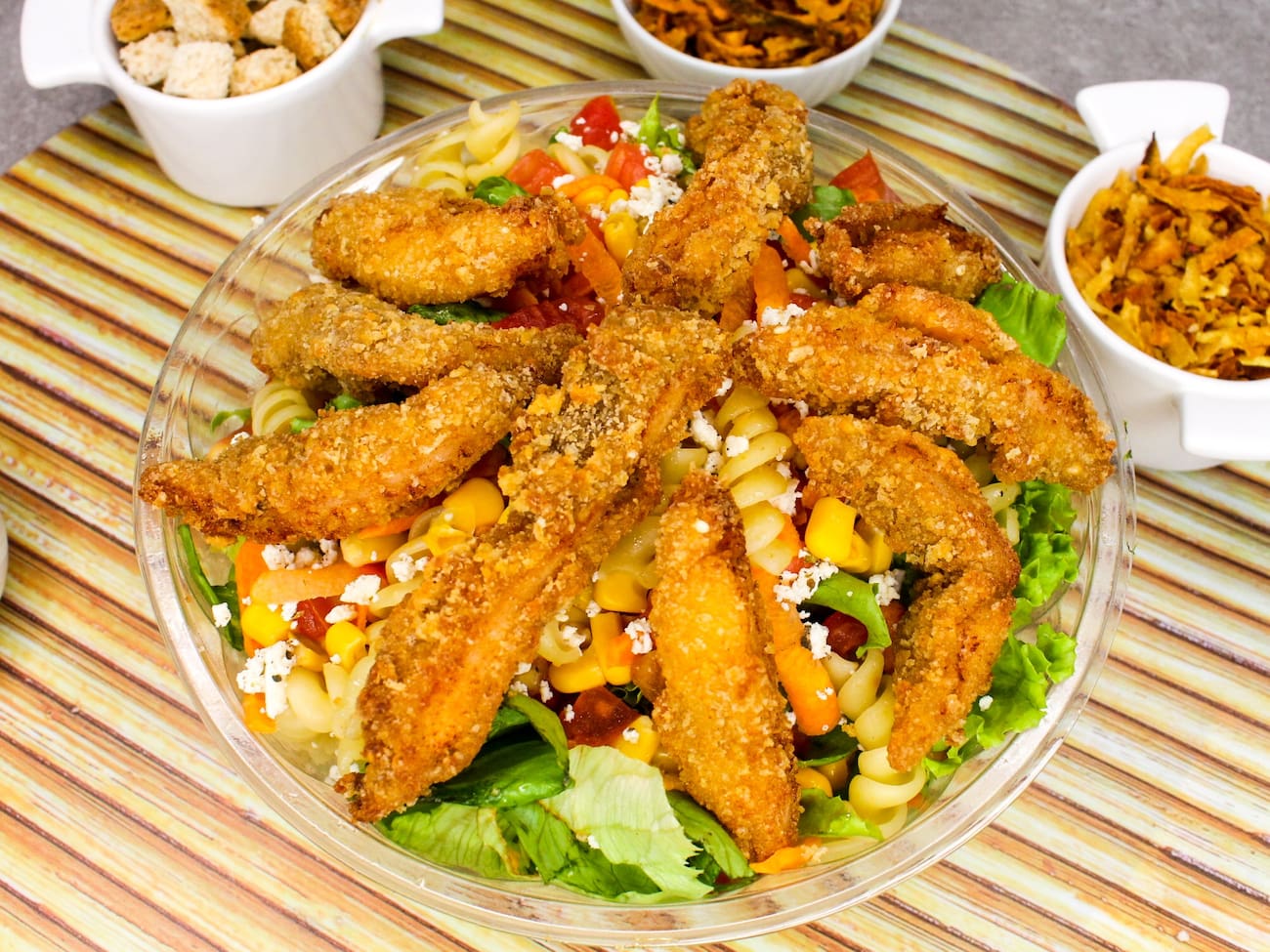 Mix de Alface + Tomate Picado + Cenoura Ralada + Frango Crocante na Panko + Ricota Light Temperada + Macarrão Fusilli.