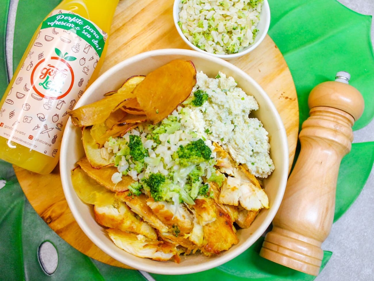 Peito de Frango em tiras + Arroz Biro Biro Light + Chips Batata Doce + Creme de Ricota Fresca. Tudo feito e preparado na Hora do seu pedido (Nada é Congelado). Enviado quentinho.