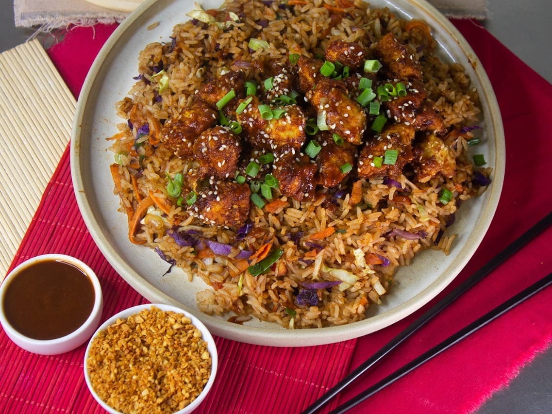 Arroz salteado no Wok com Alho, cebola, cenoura, tomate, repolhose cebolinha com Peito de Frango em Cubos temperado ao molho Bangkok Spicy da Casa (Não é extremamente apimentado). Tudo feito na hora e enviado bem quente. Serve super bem 2 pessoas.